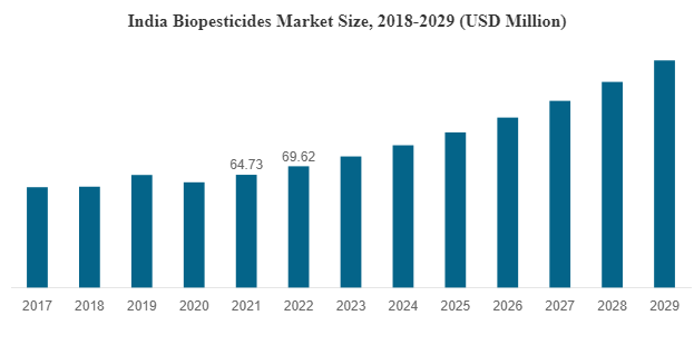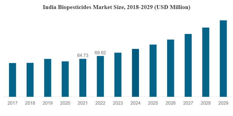 India Biopesticides Market was worth USD 88.2 million in 2021 and is further projected to reach USD 191.58 million by the year 2028, exhibiting a CAGR of 11.7% during the forecast period (2022-2028). The rapid expansion of the market is predominantly due to the rapidly growing preferences for high-quality organic food. Also, rising demand for biopesticides by farmers, since it grows faster than conventional chemical pesticides. Moreover, the excess use of chemical products in agriculture contaminates the soil and is harmful to human health. To reduce all these risks and pollution problems, eco-friendly biopesticides are rapidly growing in India. Additionally, the vast agricultural diversity and arable land in India are expected to provide significant growth opportunities for biopesticides market participants. Furthermore, market participants are spending on research and development to offer creative solutions and enhance the quality of the product. All these factors propel the growth of the India Biopesticides Market during the forecast period (2022-2028).